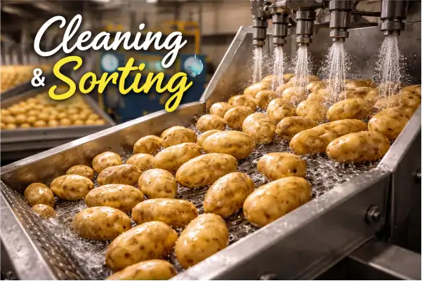 Fresh potatoes are thoroughly washed, peeled, and sorted to maintain hygiene and uniform quality.