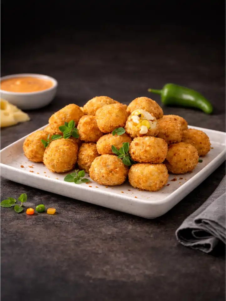 Jalapeños, Potatoes, Processed Cheese, Batter and Crumbs, Frozen American Sweet Corn, Garlic Powder, Salt, Parsley, Refined Vegetable Oil.