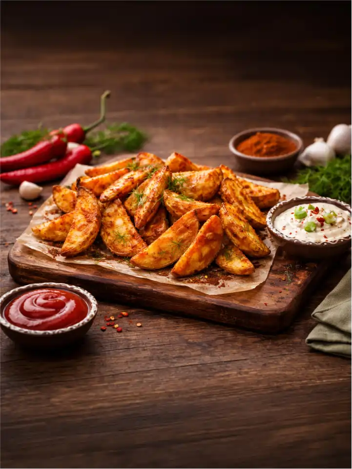 Potatoes, Batter Coating, Spices & Condiments, Refined Vegetable Oil.